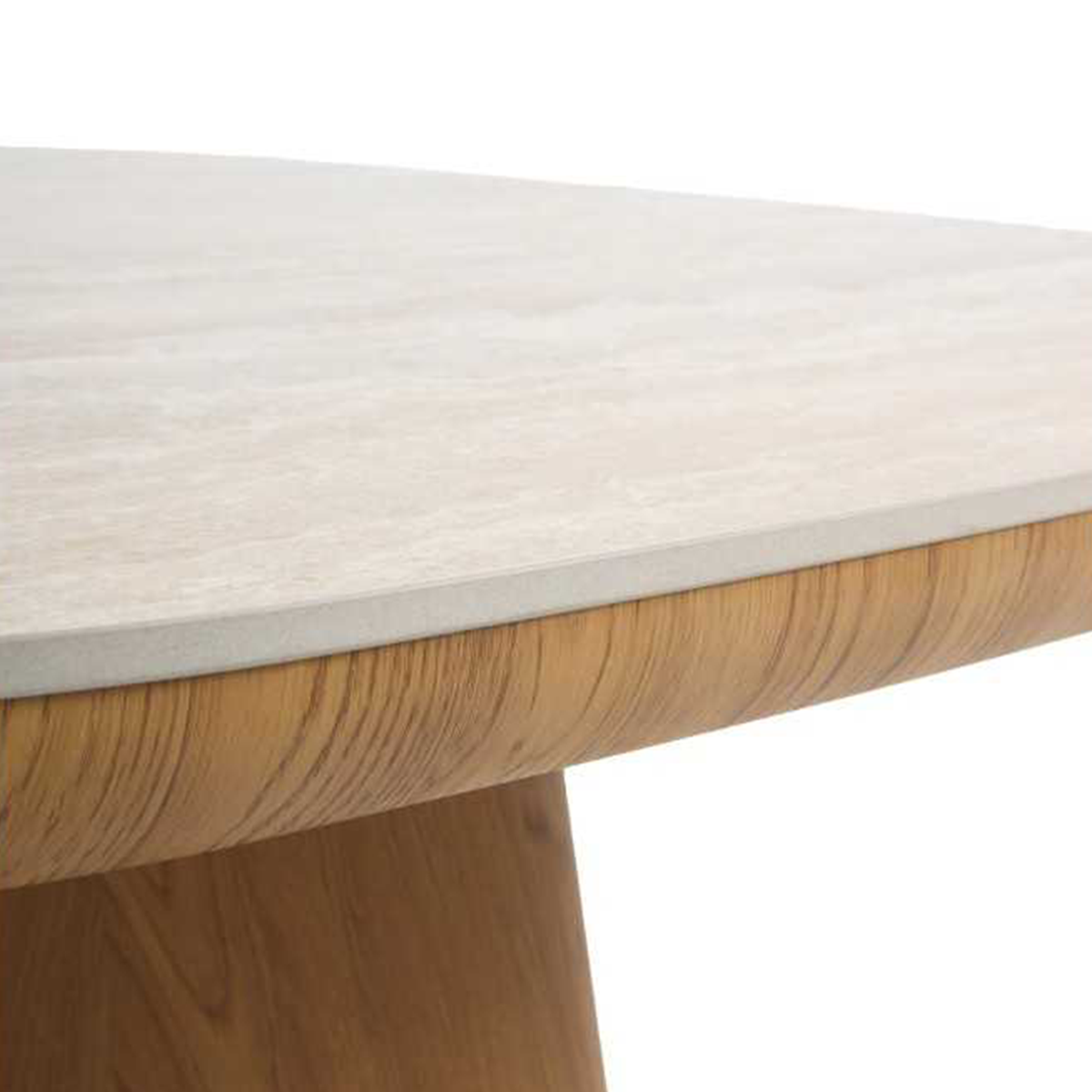 El acabado natural de la madera aporta una sensación cálida y orgánica. El cerámico de mármol travertino añade luminosidad gracias a su veteado suave y elegante. Es una mesa que transforma cualquier espacio en un ambiente acogedor, actual y con presencia.