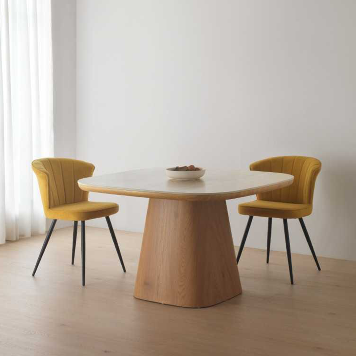 La mesa cuadrada en roble con cerámica mármol travertino es una opción perfecta si buscas un comedor con estilo, funcionalidad y un toque elegante que no pasa de moda.