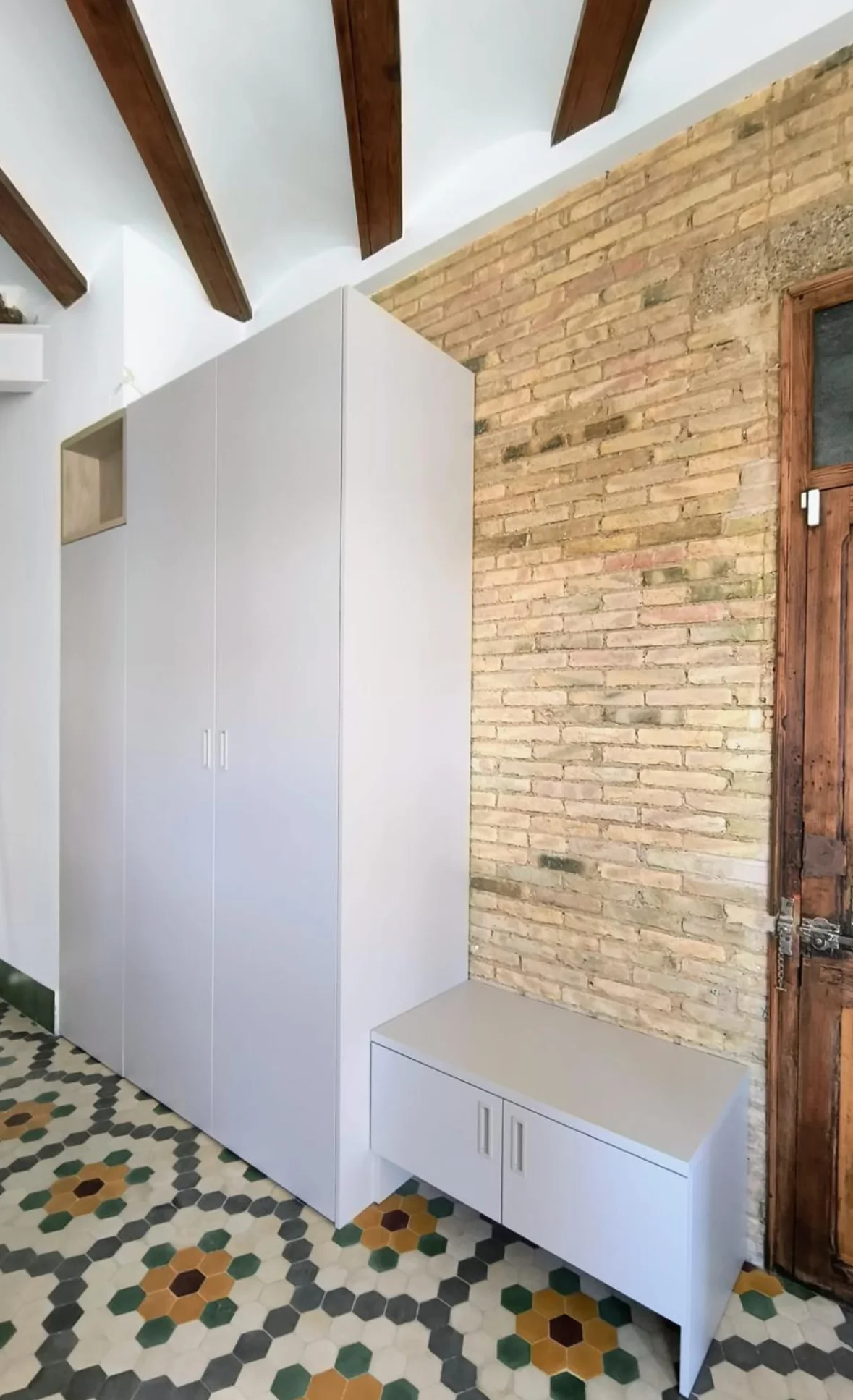 El mueble aprovecha al máximo el espacio disponible, sin interferir con los elementos originales como suelos hidráulicos, ladrillo visto o vigas estructurales, logrando una integración perfecta. Su diseño modular, limpio y atemporal lo convierte en una opción versátil tanto para viviendas particulares como para proyectos de reforma o pisos turísticos. Una pieza que ordena, decora y mejora la experiencia desde el primer paso al entrar en casa.