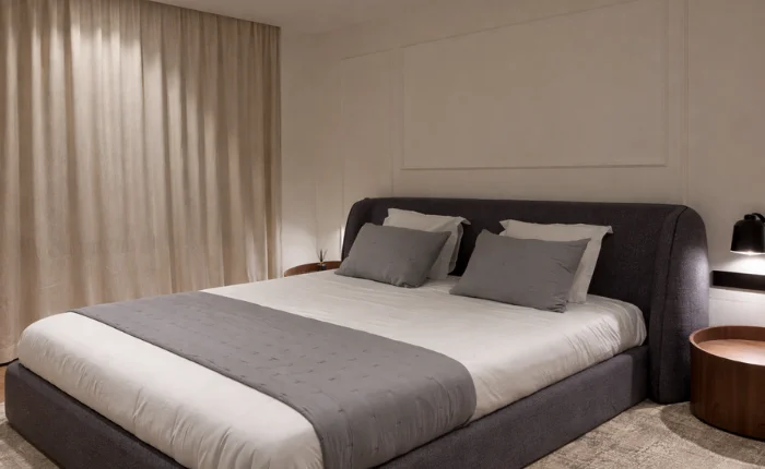 Los espacios principales se organizan de forma abierta y conectada, favoreciendo la amplitud visual y la entrada de luz. El salón–comedor se define por líneas limpias, volúmenes equilibrados y una paleta neutra que aporta continuidad y orden, reforzada por textiles ligeros y elementos decorativos sutiles. El dormitorio, por su parte, se plantea como un refugio tranquilo, donde el descanso es el eje central. La composición simétrica, los materiales suaves y la iluminación indirecta generan una sensación de confort y recogimiento, ideal para desconectar.