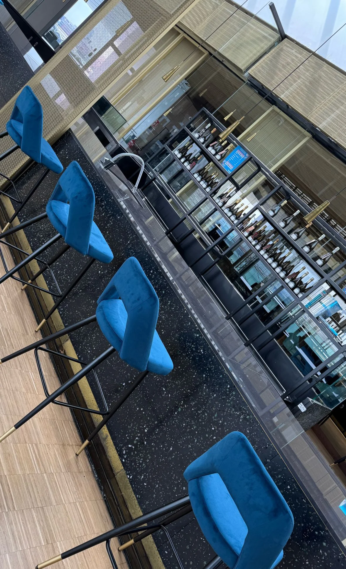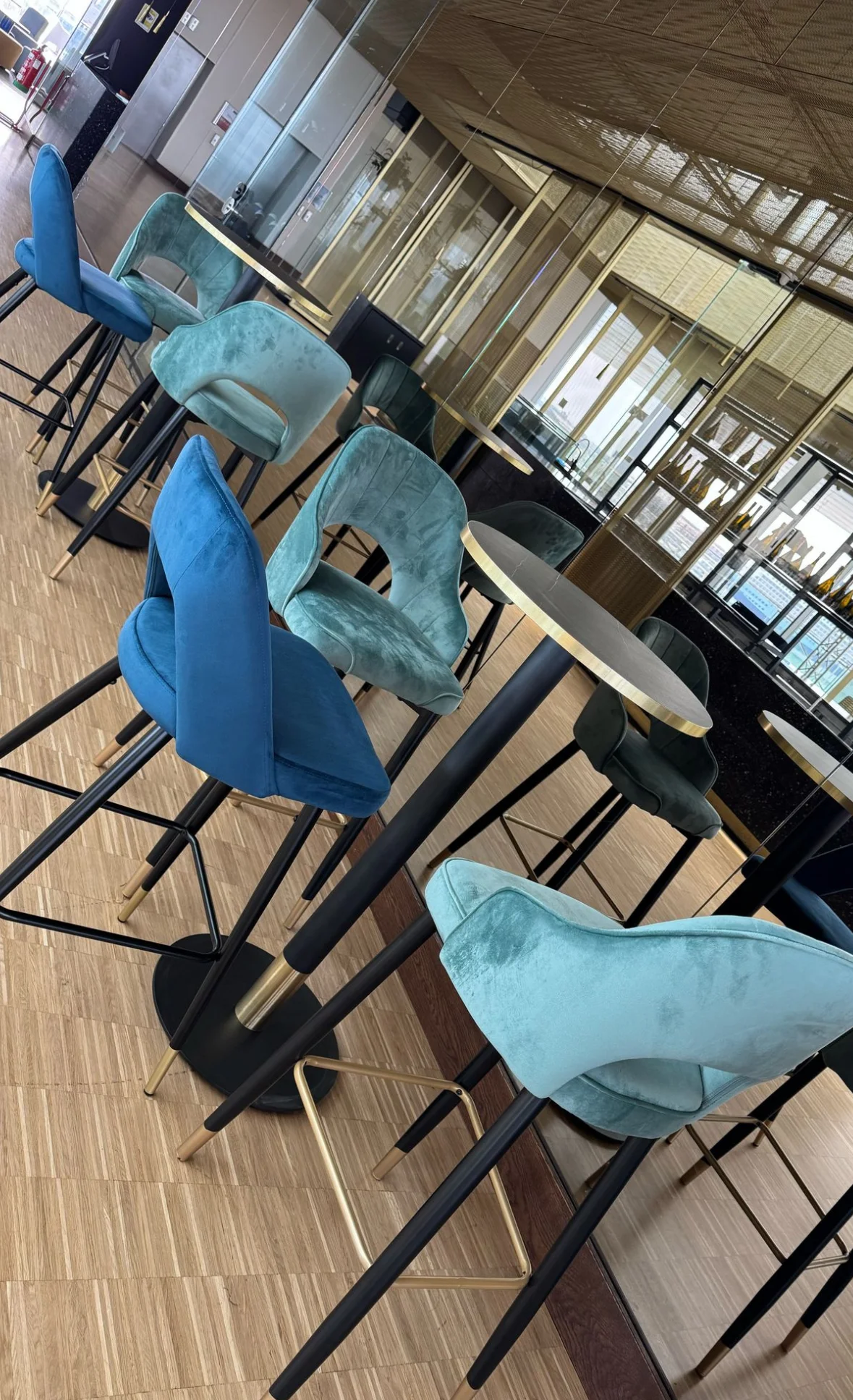 - Instalación de sofás tapizados en azul marino, adaptados a medida para integrarse a la perfección en la arquitectura del espacio. También se incluyeron pouffs en tonos burdeos, que aportan un contraste elegante y moderno, y mesas de centro con bases metálicas en acabado dorado, pensadas para brindar funcionalidad sin renunciar al diseño.