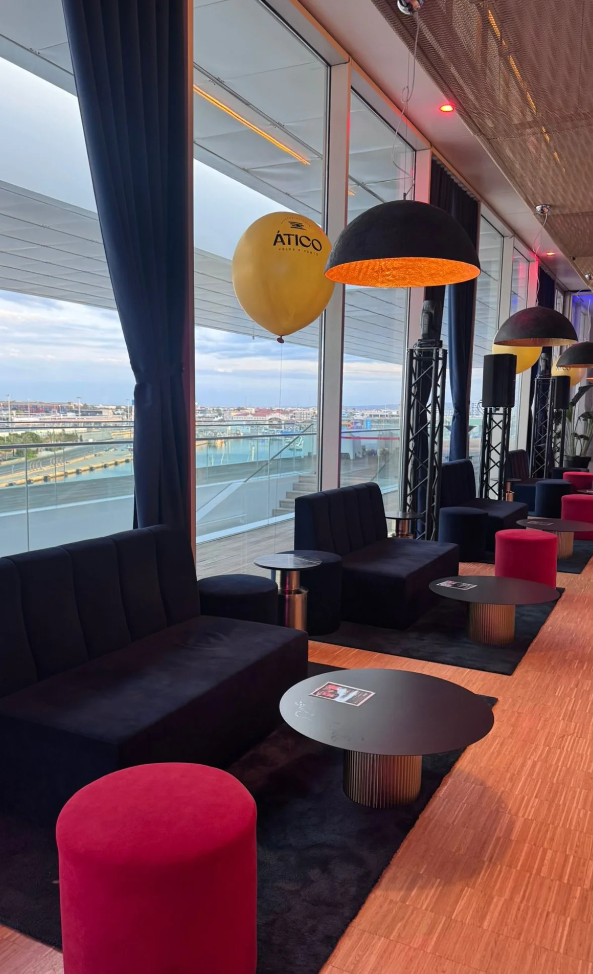 El proyecto se completó con mesas altas y taburetes de líneas contemporáneas, ideales para las zonas de cóctel y eventos. Todo el mobiliario fue concebido para integrarse armónicamente con la arquitectura del espacio, respetando su estética mediterránea y su exposición al entorno marítimo. Una intervención pensada para enriquecer la experiencia del visitante, fusionando confort, estilo y durabilidad.