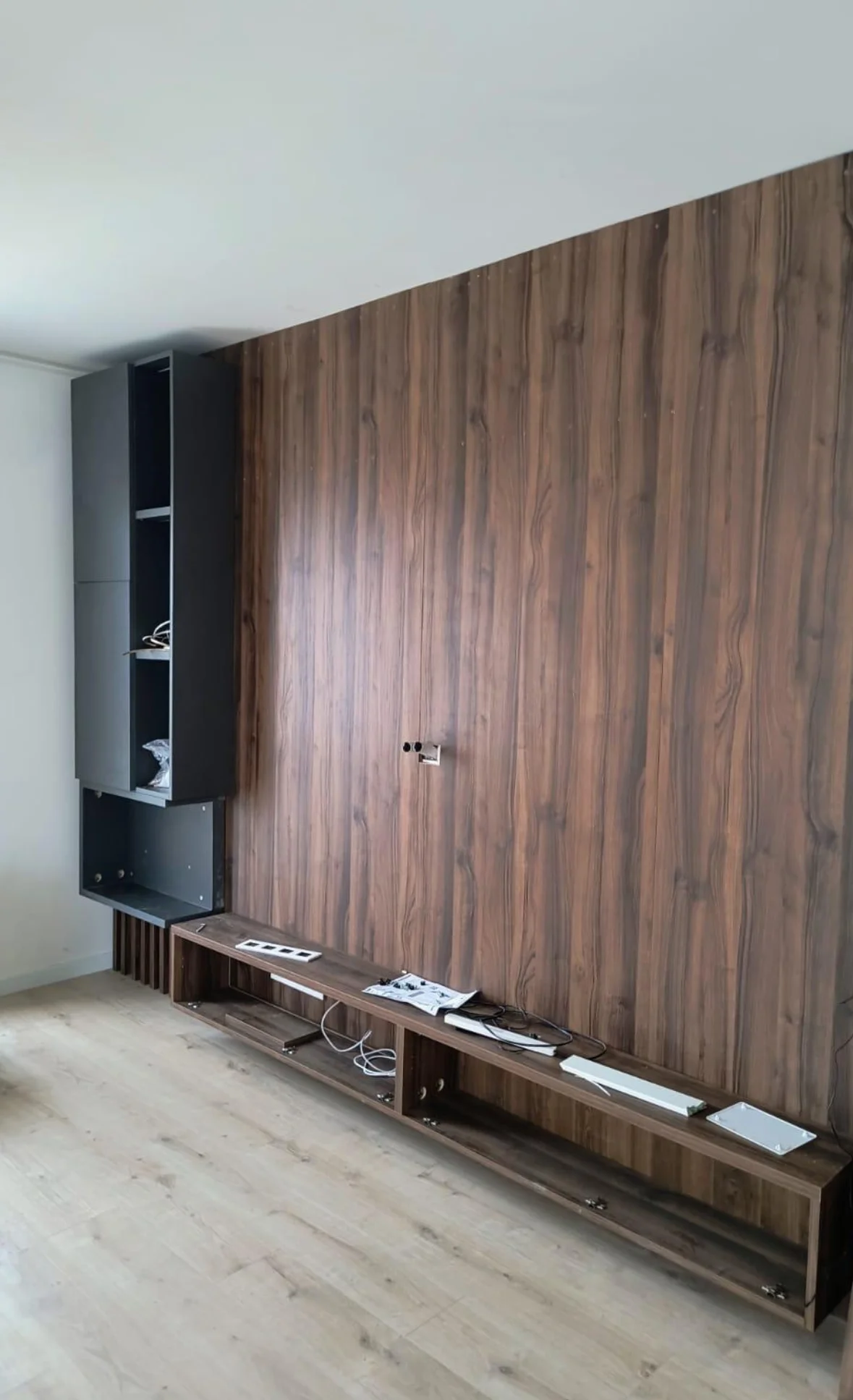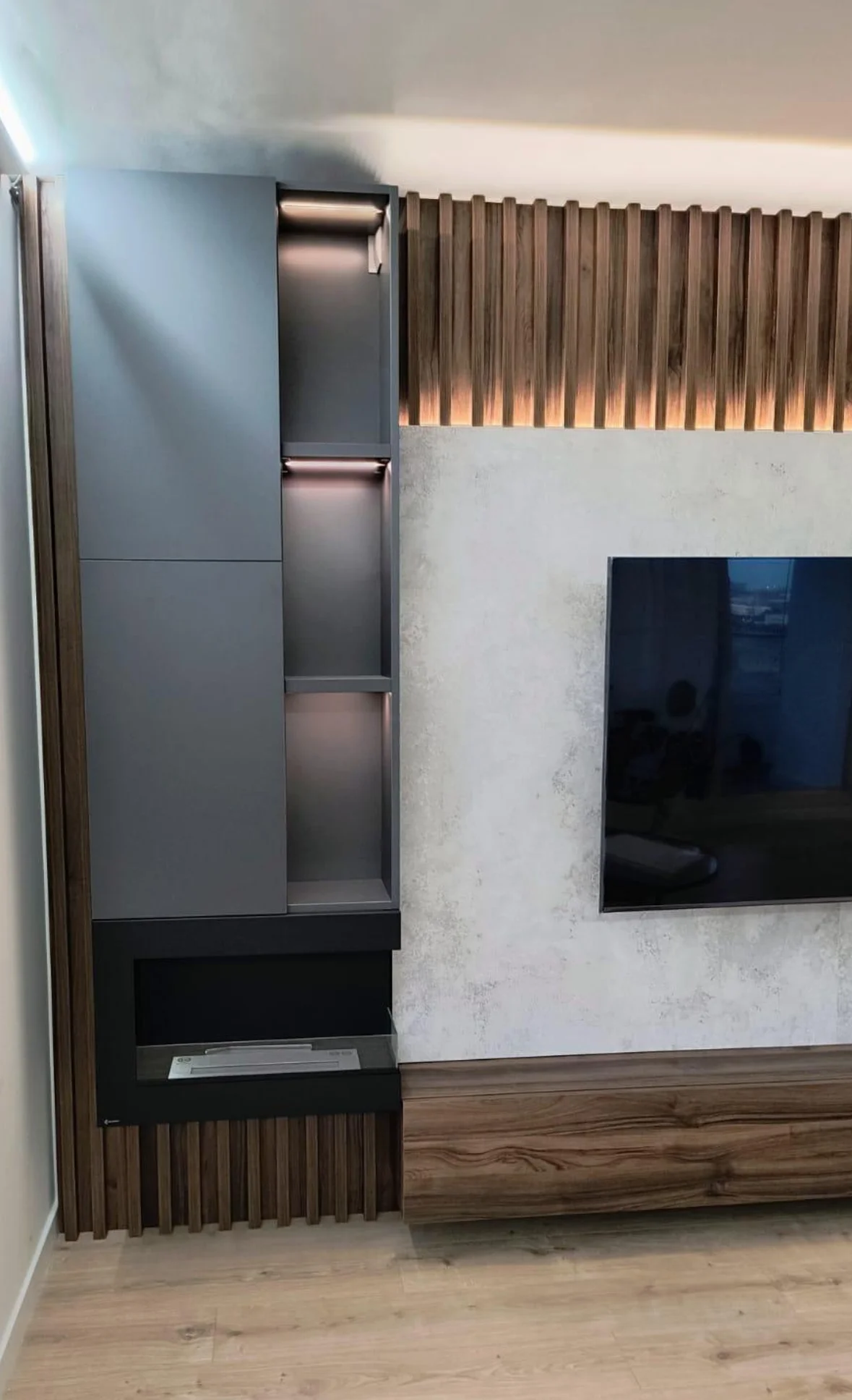 Este proyecto es un claro ejemplo de cómo el diseño a medida puede transformar una pared de salón en una pieza protagonista, funcional y estéticamente impecable. El mueble se compone de un frente audiovisual con almacenaje inferior, una estantería vertical y una chimenea integrada, todo ello enmarcado por un elegante panelado en madera estriada que aporta textura, ritmo y profundidad al espacio.