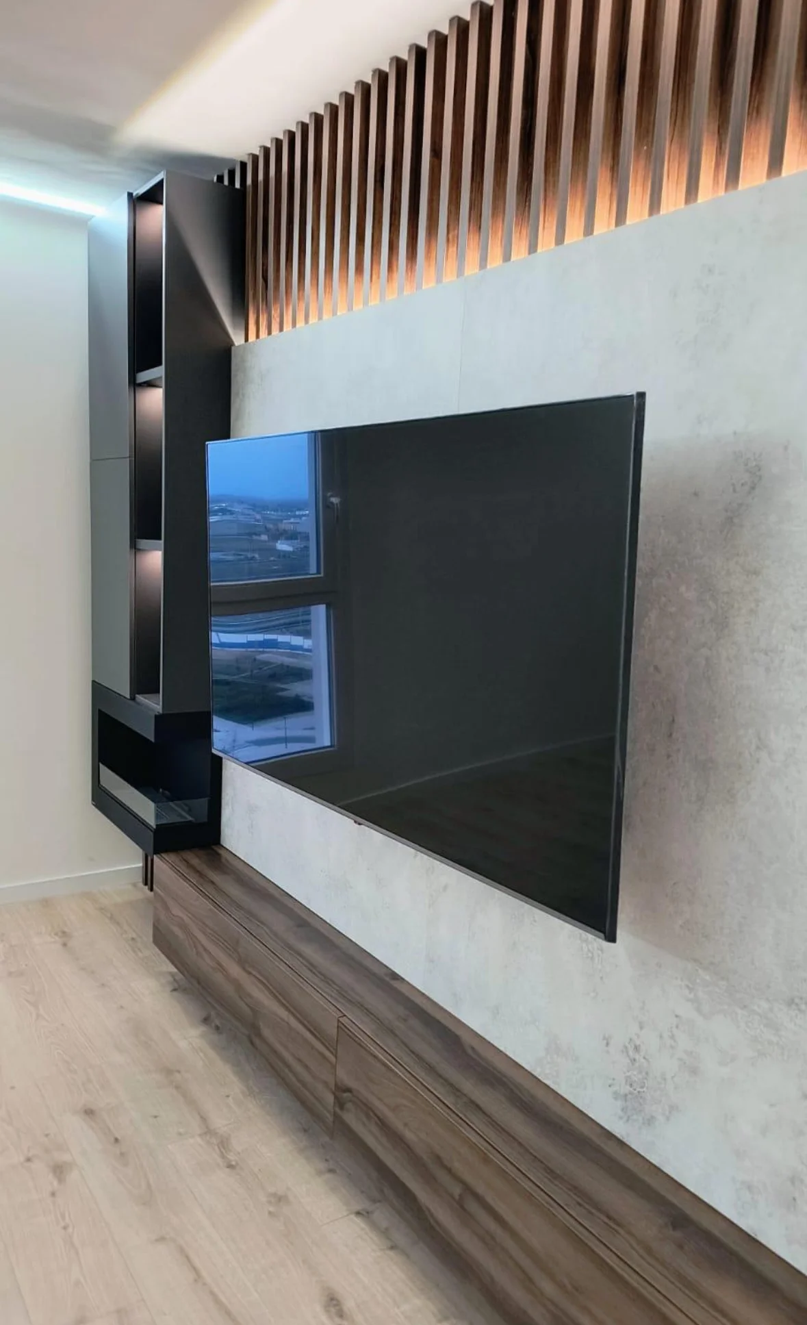 El área central, revestida con paneles en tono beige cálido, genera un contraste sutil que realza la pantalla y equilibra el conjunto. El resultado es un diseño sobrio, contemporáneo y cálido, pensado para integrarse con naturalidad en el salón y elevar su valor estético y funcional.