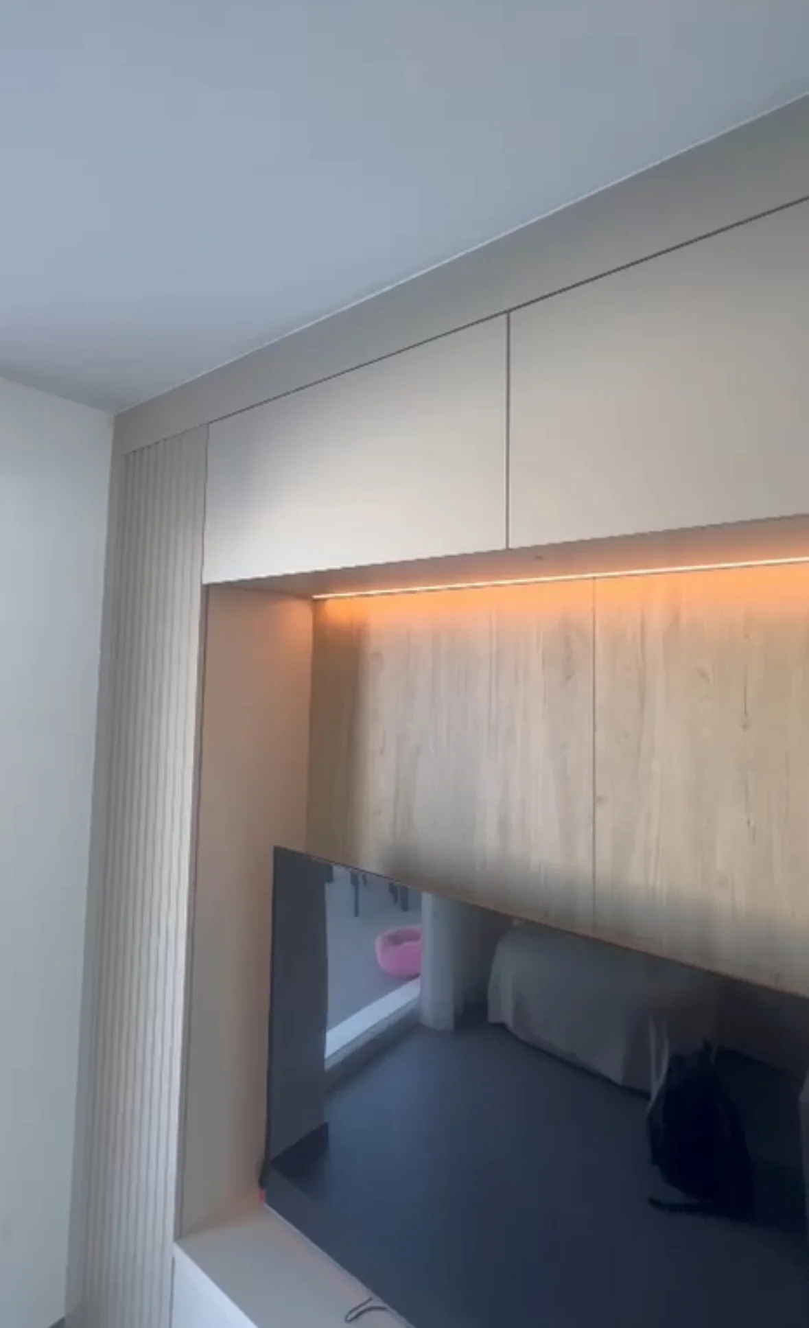 El panelado de madera natural enmarca el televisor y aporta continuidad visual, mientras que los módulos superiores y bajos en acabado liso beige ofrecen gran capacidad de almacenamiento sin recargar el ambiente. La estantería abierta, con iluminación LED integrada, crea un rincón decorativo perfecto para piezas escultóricas o elementos personales.