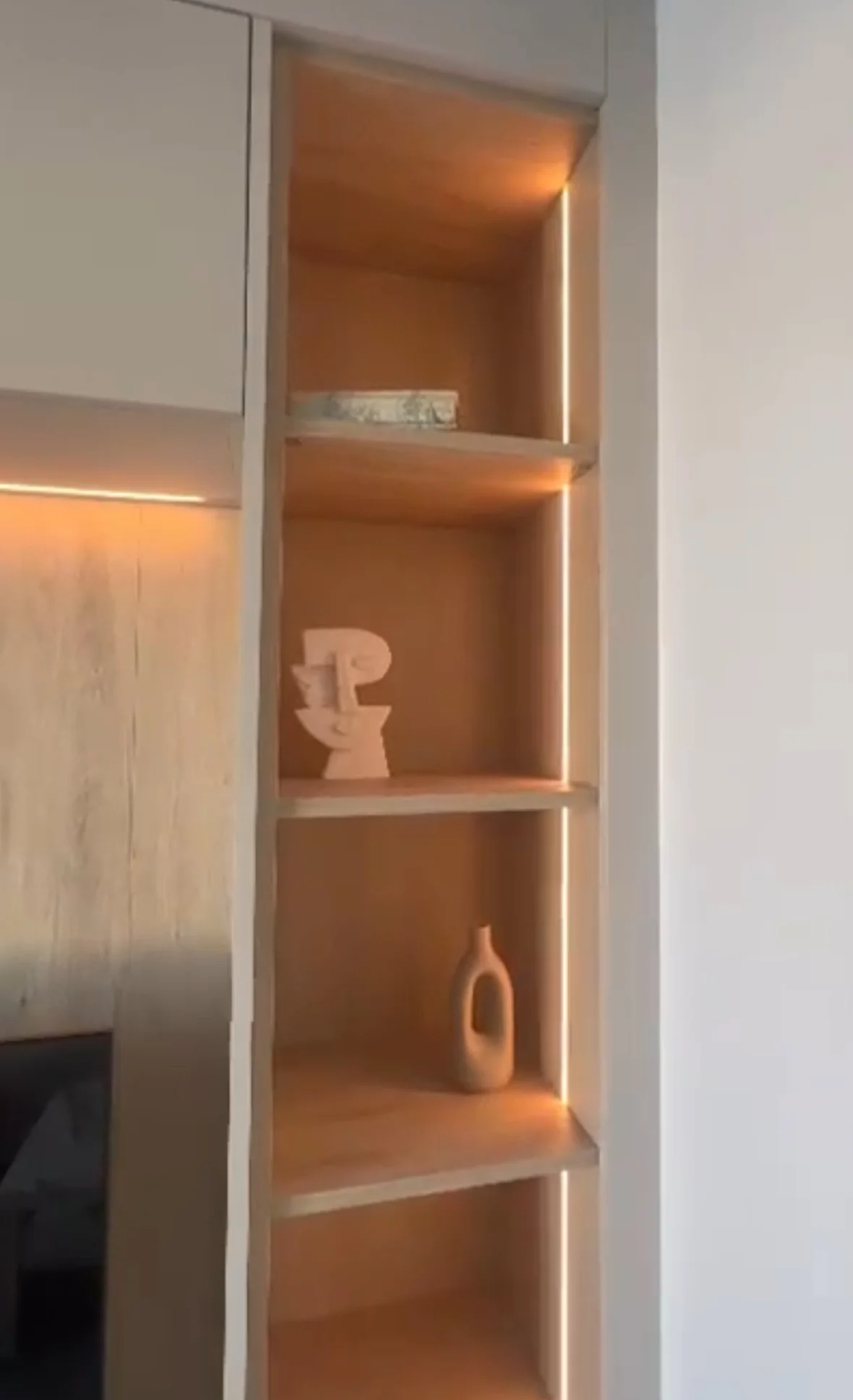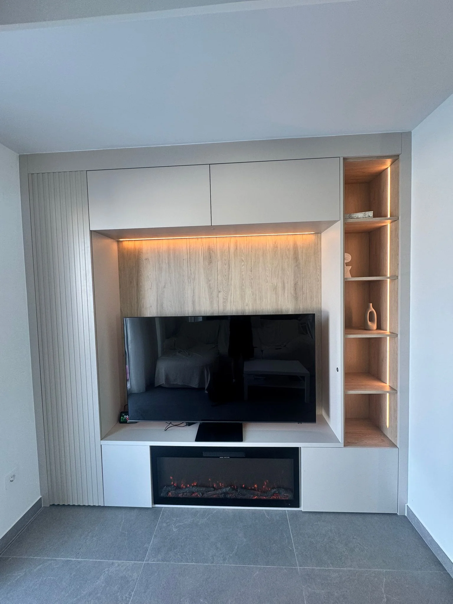 Diseño a medida que fusiona estética y funcionalidad en un solo frente de salón. Este mueble a medida para salón integra una zona audiovisual con chimenea decorativa, almacenaje superior y una estantería lateral retroiluminada que aporta calidez y estilo al espacio.