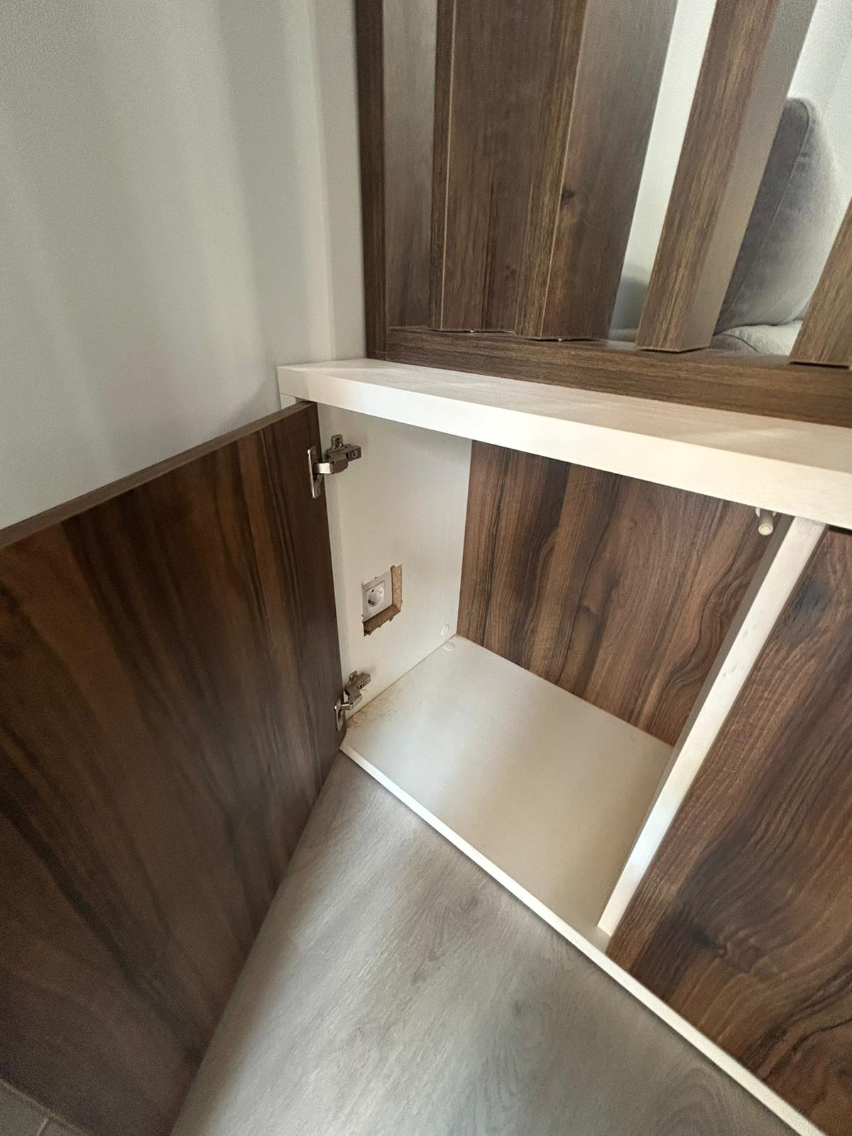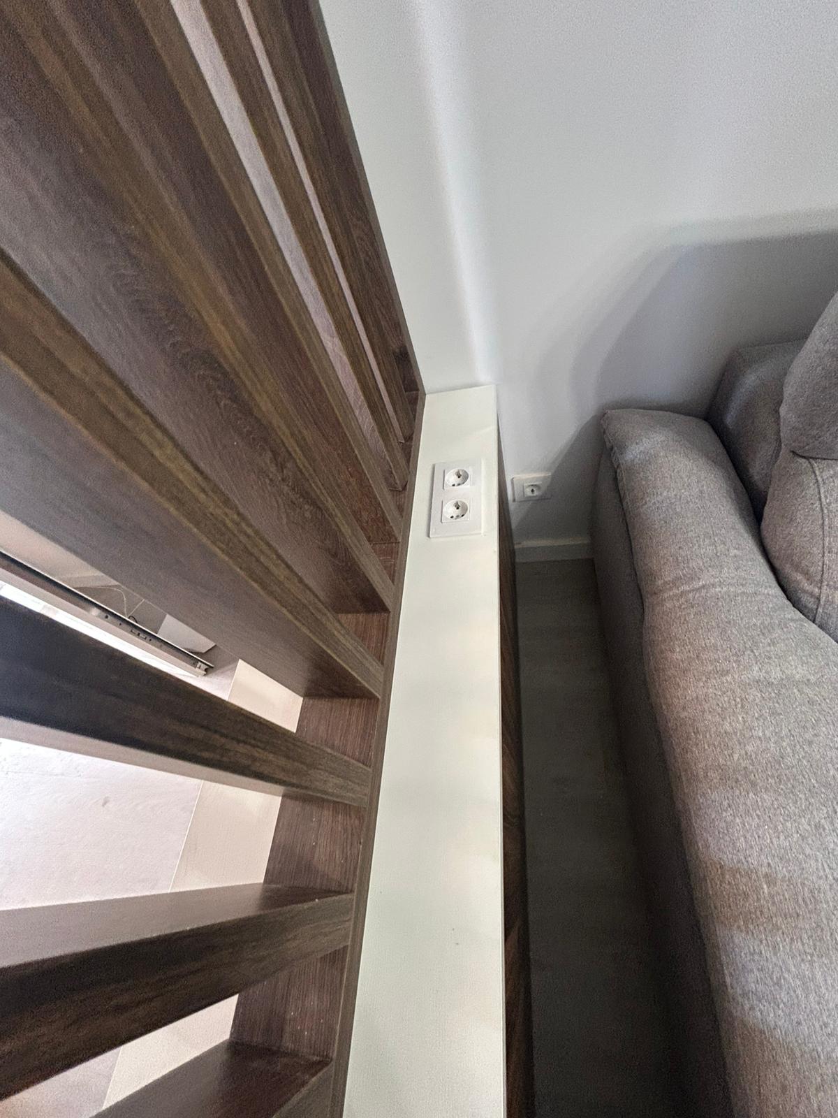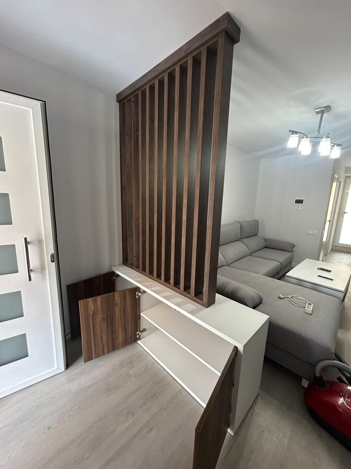 Este mueble a medida funciona como un elemento divisor sutil y elegante, ideal para viviendas con concepto abierto o espacios interconectados. Su diseño combina lamas verticales de madera que aportan calidez y permiten el paso de la luz, con una base cerrada inferior que ofrece capacidad de almacenaje o soporte decorativo.